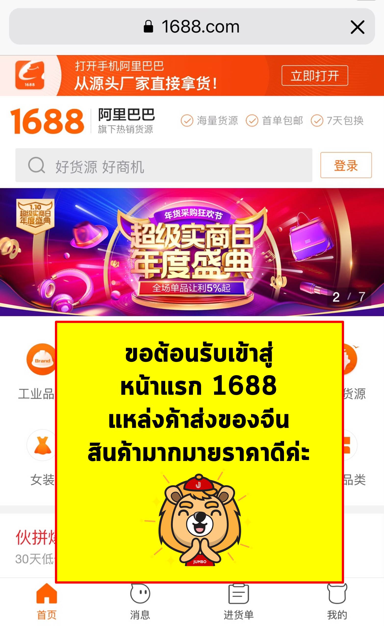 ก่อนอื่นเลยหากเข้าไปที่ www.1688.com จะเจอหน้า Home ของเขาก่อนเลย ( เราเปิดจากมือถือเพื่อความสะดวกคล่องตัวค่ะ >w< )